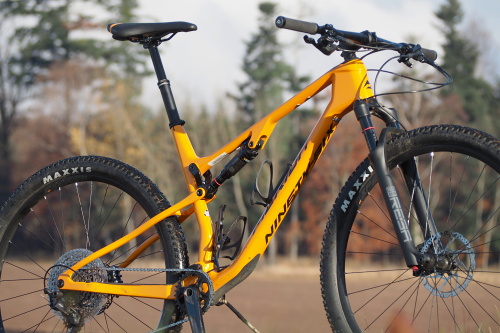 Kolo postavené na karbonovém rámu s odpružením Rockshox v provedení Select plus a pohonu a brzdách Shimano. Žádný vyloženě slabý článek ve výbavě nenalézám, vše plně funkční, žádný komponent nevyčnívá z vyššího komponentového průměru. Napříč velikostmi se mění i charakteristika odpružení. Čím delší rám, tím progresivnější chod. Dává to smysl, protože vyšší jezdec obvykle bude těžší.Odladění progresivity bych se nebál označit jako výborné. Zadní stavba je příjemně progresivní s kultivovaným chodem využívající téměř celý zdvih pístnice.